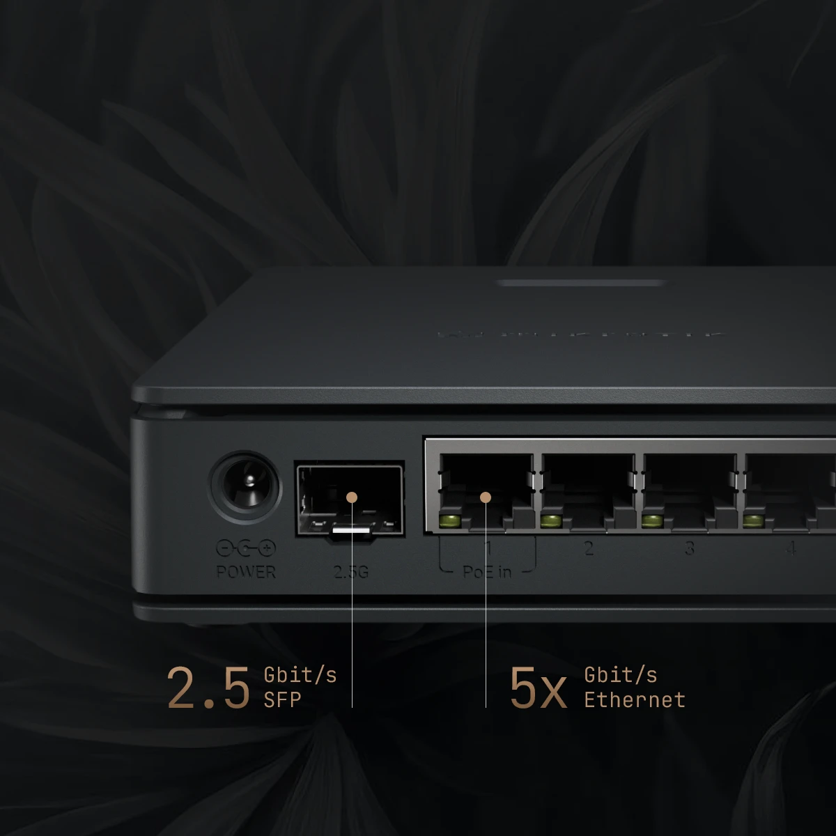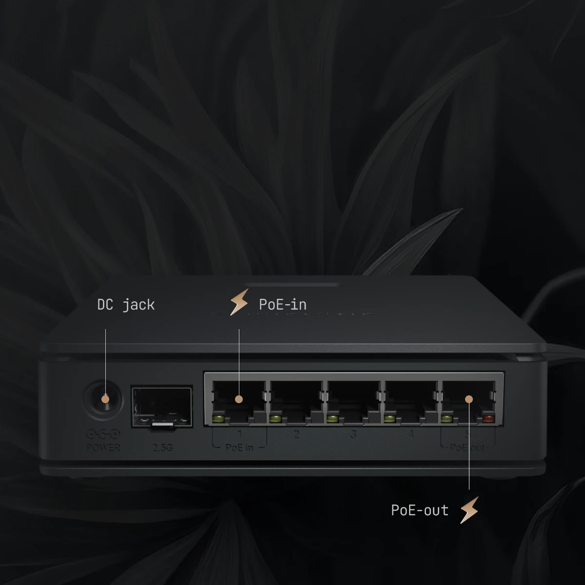 | 5 × Gigabit Ethernet | PoE-in + PoE-out | RouterOS v7 |
