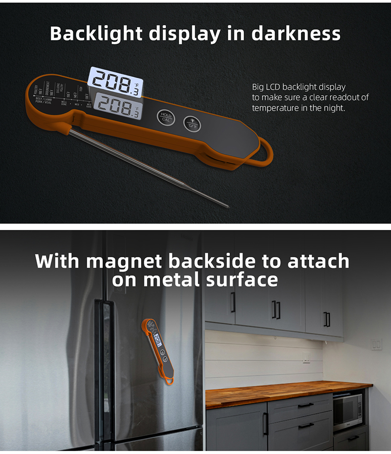 Featuring a backlit LCD, this Instant Read Digital Meat Thermometer provides clear visibility even in low-light conditions. Its IP66 waterproof rating protects against splashes and spills, making it safe to use around busy kitchens and BBQ setups. Lightweight and portable, it fits easily into your cooking toolkit.